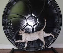 There are treadmills for horses, underwater horse treadmills, and swimming pools for horses and bulls. Why not an exercise wheel for cats?